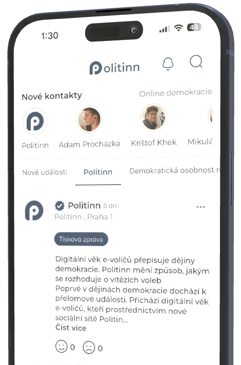 dovolujeme si oznámit spuštění nové sociální sítě Politinn – první evropské platformy, která díky vybudované digitální demokratické infrastruktuře, inovativním strategickým funkcím a pokročilým bezpečnostním mechanismům umožnila vznik ONLINE DEMOKRACIE – prvního politického systému v kyberprostoru na světě.